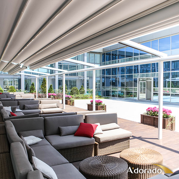 פרגולות מעוצבות חשמליות בעיצוב המותאם לפי דרישה, בעלות שלדת אלומיניום ונירוסטה אל חלד חזקה במיוחד וגג העשוי מבד תלת שכבתי בעל בידוד פחמי המתגלגל פנימה למערך הגנה מירבי ושימרה מפני נזקי האקלים והשמש תוך שימוש מירבי בתאורה טבעית חיצונית לכל שטח המתחם.